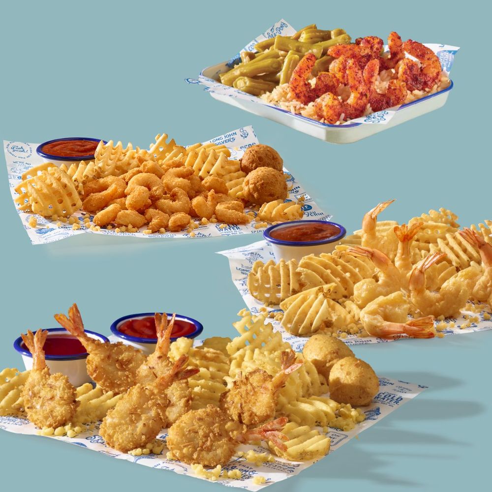 One piece classic battered Alaska pollock, one piece classic battered all-white meat chicken, two pieces classic battered shrimp, one side, two hushpuppies, and drink.